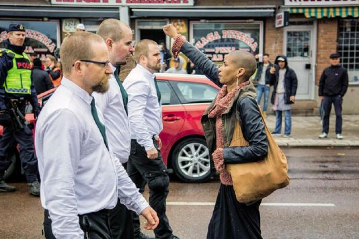 Le 1er mai 2016, Tess Asplund, une Suédoise de 43 ans, se plante devant les trois leaders néonazis du Nordiska Motståndsrörelsen (NMR, Mouvement de résistance nordique), qui défilent en procession dans une rue de Borlänge, au cœur de la Suède. Elle les toise, le poing fermé, brandi en l’air. David Lagerlöf, photographe du magazine antiraciste Expo, saisit l’instant, avant que des policiers l’éloignent.