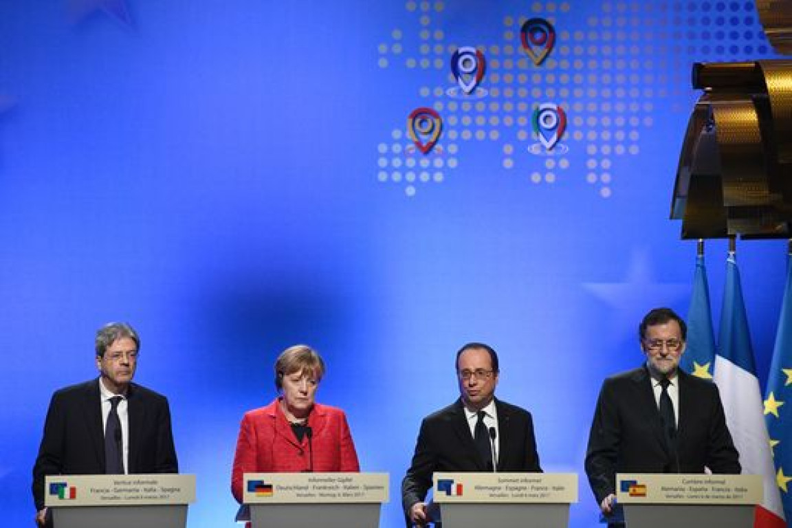 Versailles, où fut signé le traité mettant fin à la première guerre mondiale et créant les conditions pour la seconde, est l’un des lieux-clés de l’histoire tourmentée du XXe siècle. Ce mini-sommet voulait symboliser l’engagement de ces quatre dirigeants pour une relance de l’Europe. Ils sont pourtant eux-mêmes bien fragiles. François Hollande est sur le départ. Angela Merkel n’est pas sûre de l’emporter aux élections de septembre. Paolo Gentiloni risque de ne pas réussir à se maintenir au pouvoir jusqu’à la fin de la législature en février 2018. Et l’Espagnol Mariano Rajoy, le leader de la droite populaire, n’a une majorité que grâce à l’appui extérieur des socialistes.