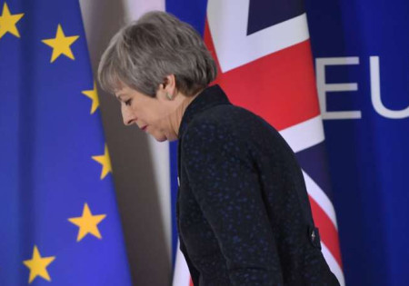 La première ministre britannique, Theresa May, après la conférence de presse, le premier jour d’un sommet européen consacré au Brexit, à Bruxelles,...
