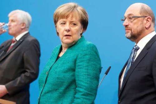 A ses côtés, la chancelière Angela Merkel et le patron du SPD, Martin Schulz, semblaient plus préoccupés. Certes, l’un et l’autre se sont félicités du résultat de leurs tractations. « Cela valait la peine », a commenté la présidente de la CDU, convaincue que ce « contrat de coalition » sera « le fondement du gouvernement stable dont notre pays a besoin et que beaucoup dans le monde attendent de nous ».