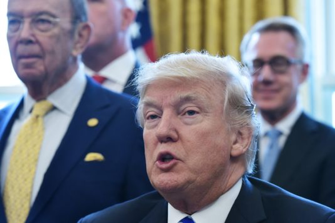 Le président américain Donald Trump annonce le feu vert au projet de pipeline Keystone XL, le 24 mars, au bureau Ovale de la Maison Blanche à Washington. MANDEL NGAN / AFP